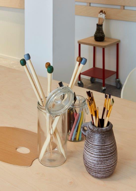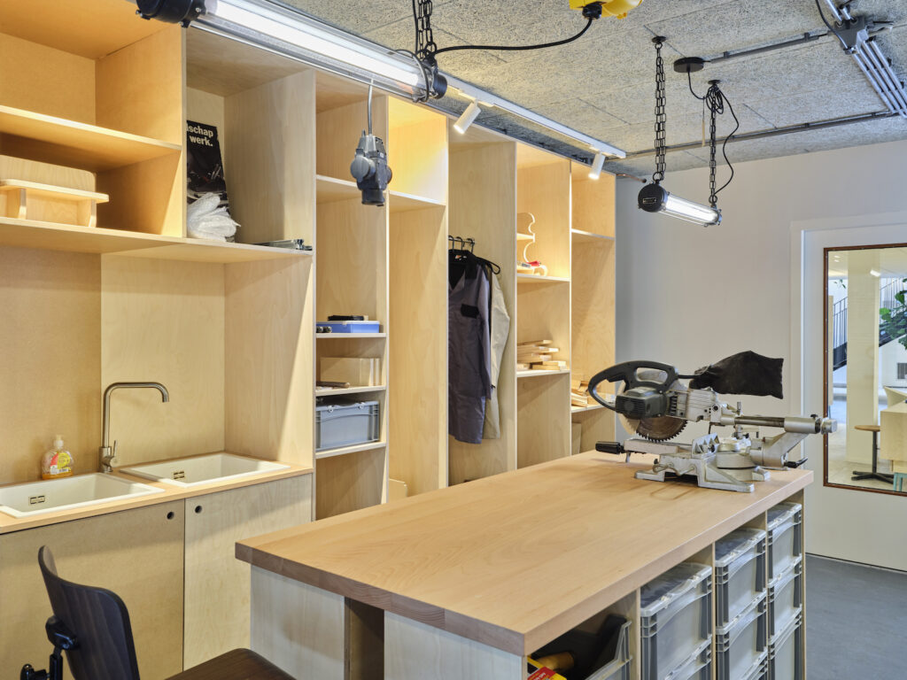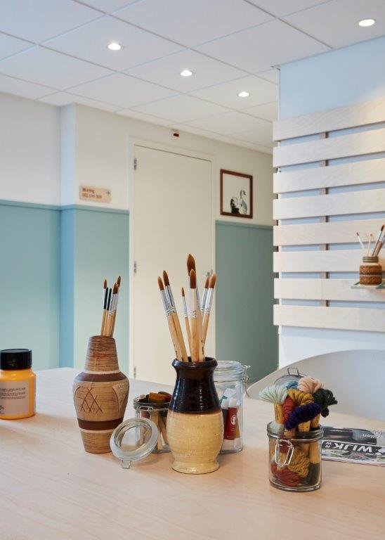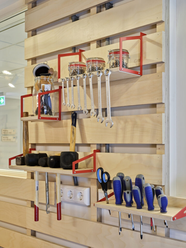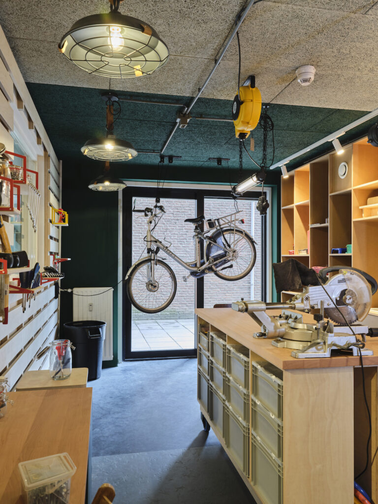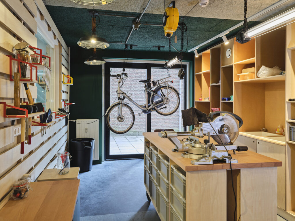 Dit is het schuurtje in de achtertuin, maar dan met eindeloze mogelijkheden. Er staat een grote werkbank, op de wanden aan de muur hangt gereedschap en in kleine bakjes zijn alle schroefjes netjes opgeborgen. Hier wordt heerlijk geklust. Als er bij een bewoner iets stuk is, dan wordt het naar deze werkplaats gebracht.