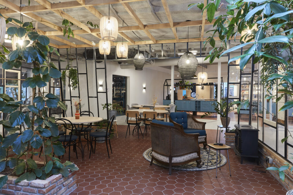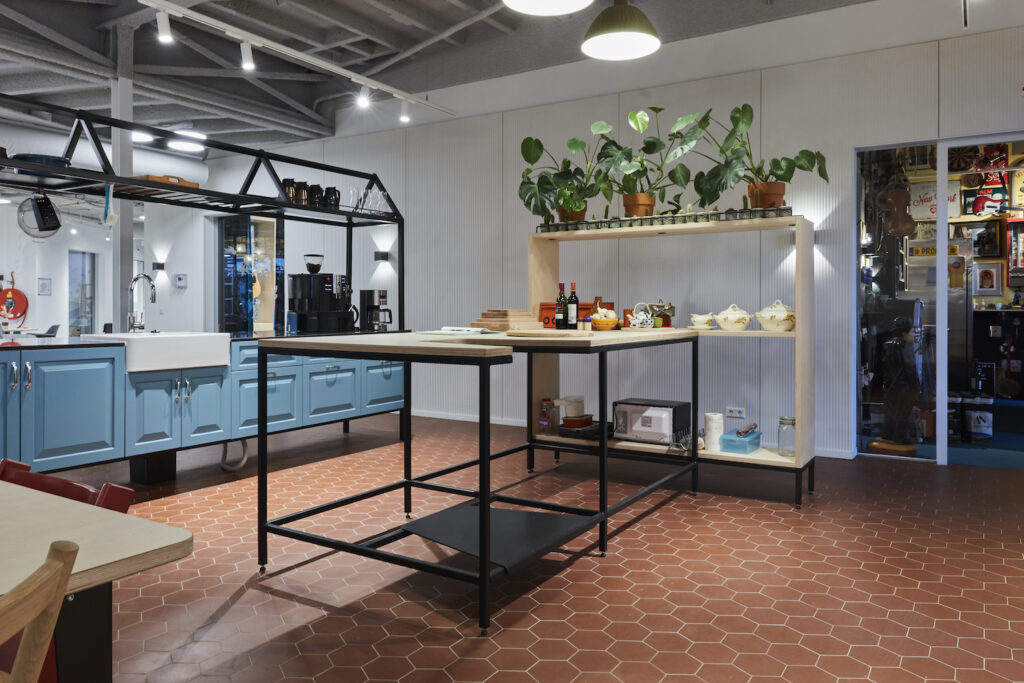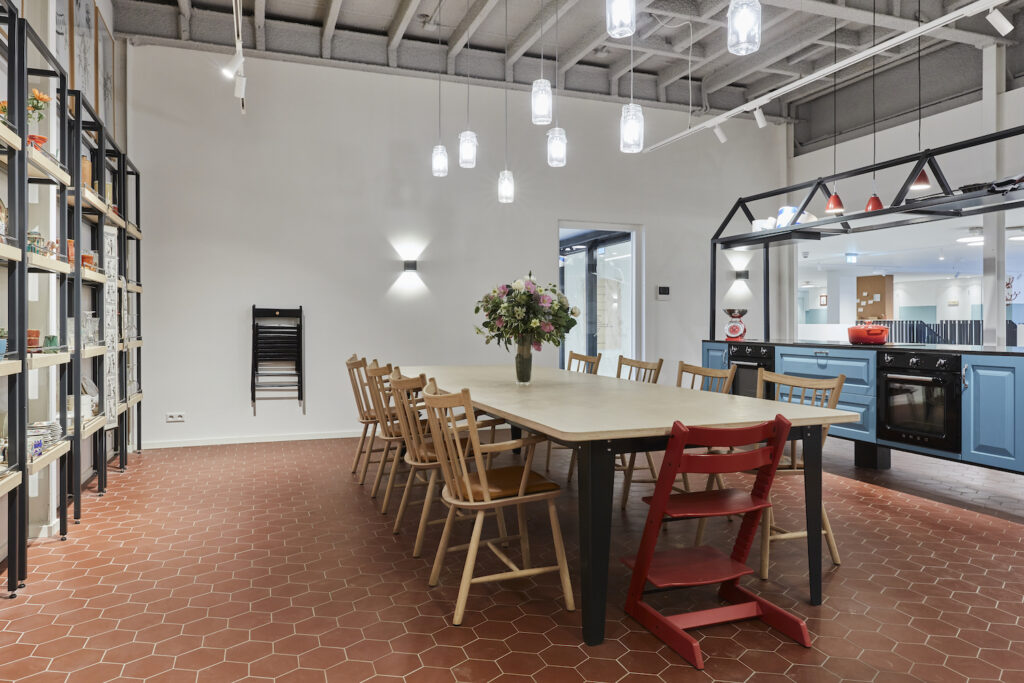 Eigenlijk is dit het kloppende hart van het huis. Hier komt iedereen in de ochtend een kopje koffie drinken (voor een kleine bijdrage kan je hier heerlijke koffie maken van vers gemalen bonen), worden dagelijks taarten gebakken voor bewoners en er vinden regelmatig kookworkshops plaats.