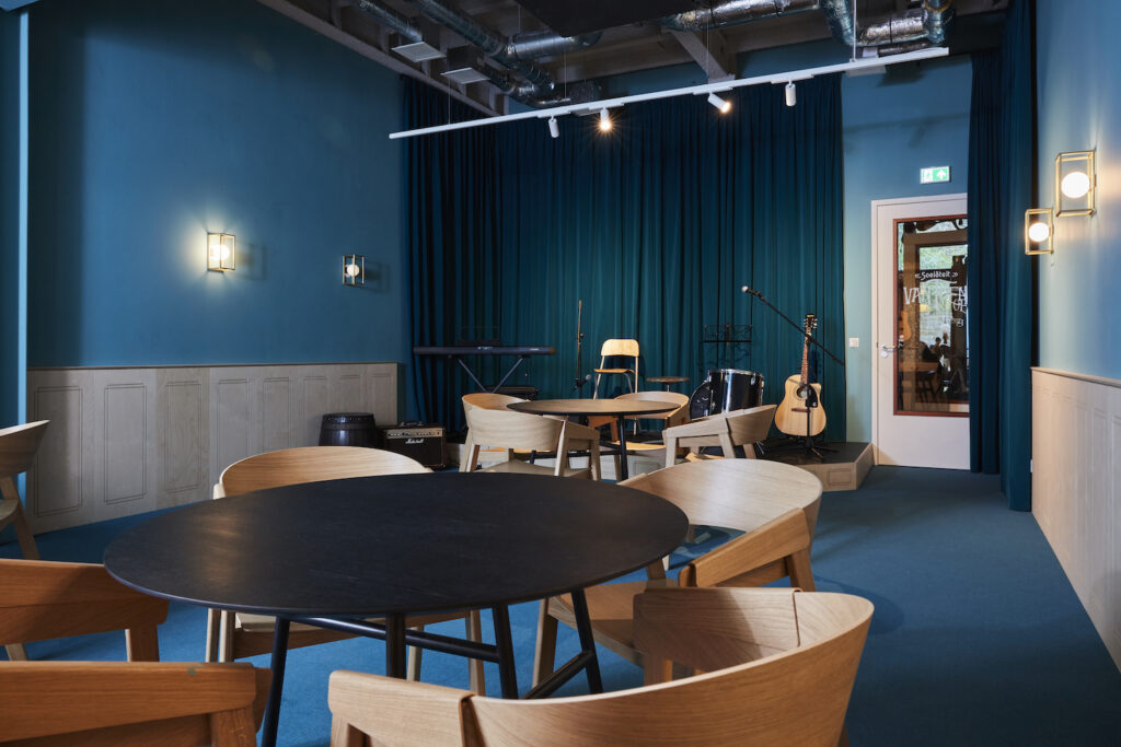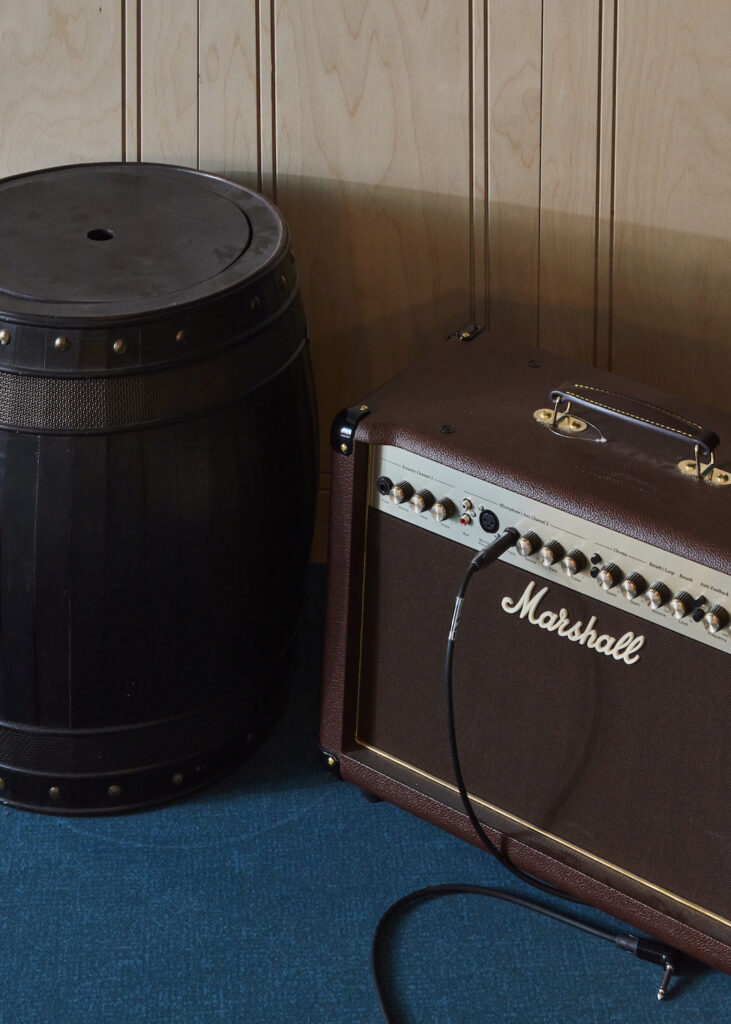 Deze ruimte is een genot voor ogen en oren. Alles op het gebied van muziek is hier te vinden. Er is een prachtig podium en de apparatuur staat een ieder ter beschikking. Een prachtige plek waar je je talenten tot bloei kunt laten komen of volop kunt genieten van de optredens.
